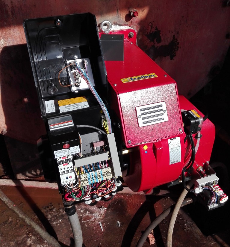 Se puede apreciar un quemador marca F.B.R. (Blowtherm) desarmado para realizar el mantenimiento. Para una mantención de calidad se debe desarmar el equipo por COMPLETO