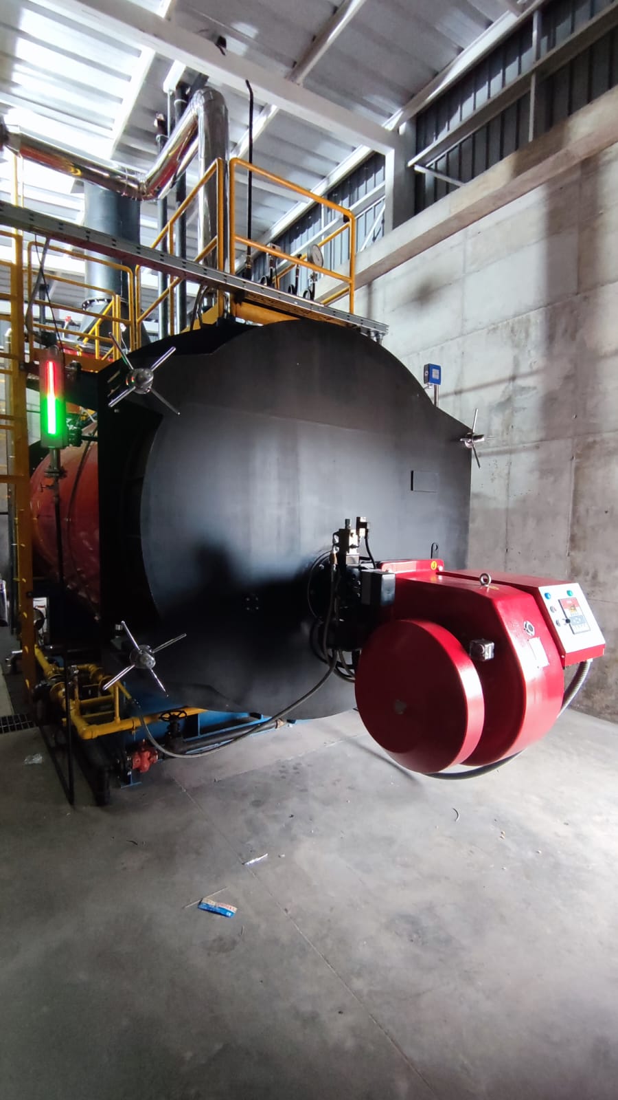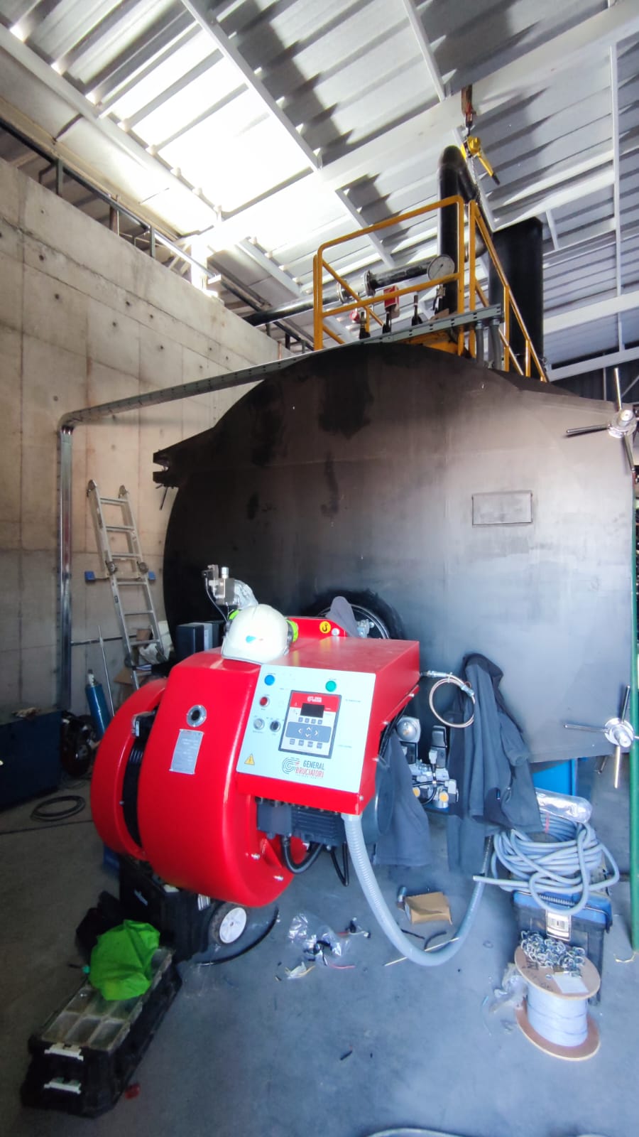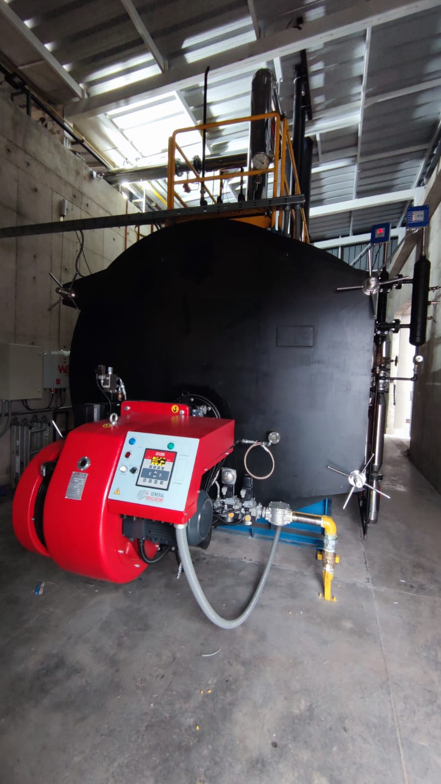 Descripción: Se realiza montaje electrico y puesta en marcha de caldera nacional "Calderas Industriales" con sistema economizador de agua modulante y quemador General Bruciatori con sistema electronico ETC6000 (GLP-Diesel).